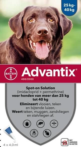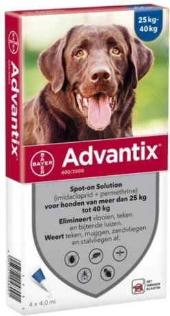 Advantix 400/2000 voor honden van 25 tot 40 kg beschermt uw hond tegen vlooien, teken, muggen en steekvliegen.