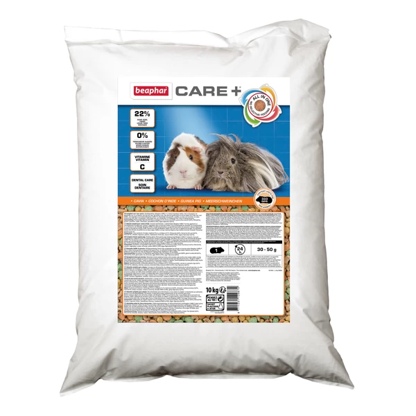 Het voer heeft extra vitamine C omdat cavia die zelf niet kunnen aanmaken en een ruw vezelgehalte van 22% voor een goede gezondheid en voor een optimale spijsvertering. Voordat je overschakelt naar deze voeding is het belangrijk om geleidelijk aan over te schakelen van het ene naar het andere voer. Mix daarom gedurende de eerste dagen het oude voer met Care+. De dagelijkse hoeveelheid Care+ is afhankelijk van gewicht, conditie en mate van activiteit.