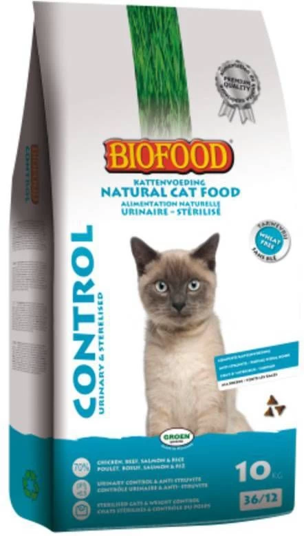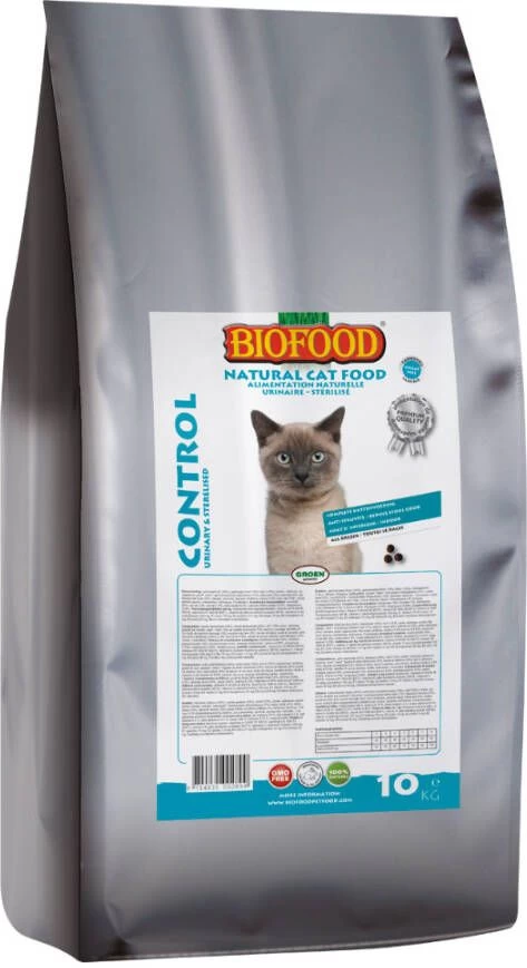 Biofood Kattenvoer Premium Control Urinewegen/Gesteriliseerd 10 kgBiofood control is hoogwaardige volledige natuurlijke kattenvoeding die ontwikkeld is voor volwassen katten, ter ondersteuning van de urinewegen en bij overgewicht (bijv. sterilisatie). * 70% aan kip, zalm, kippenlever en rijst * Met prebiotica FOS (inuline), zalmolie met omega 3 en 6 vetzuren en taurine * Hoge acceptatie en verteerbaarheid * Voor katten met struvietaandoeningen zoals blaasgruis en stenen * Ondersteunt de urinewegen. Regelt de pH van de urine (in de richting van.
