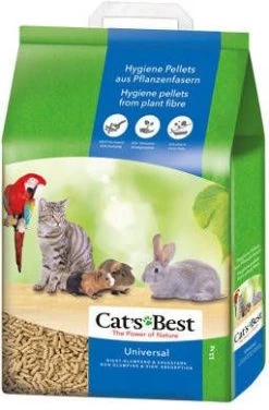 Universal van Cat’s Best is een bodembedekker in de vorm van pellets. Deze zijn gemaakt van plantaardig materiaal en absorberen vocht zeer goed. Daarnaast helpt het om nare geurtjes te voorkomen. Omdat de pellets gemaakt zijn van plantaardig materiaal zijn ze biologisch afbreekbaar. Cat’s Best is zowel geschikt als bodembedekker voor verblijven van kleindieren als kattenbakvulling.
