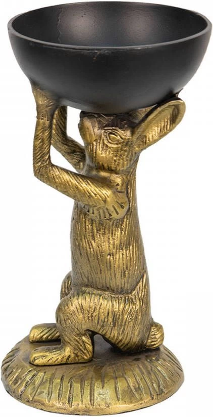 Vintage goudkleurig konijn als voet van decoratief zwarte schaal van het merk Clayre & Eef. Fruitschaal PresenteerschaalProductinformatie: