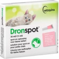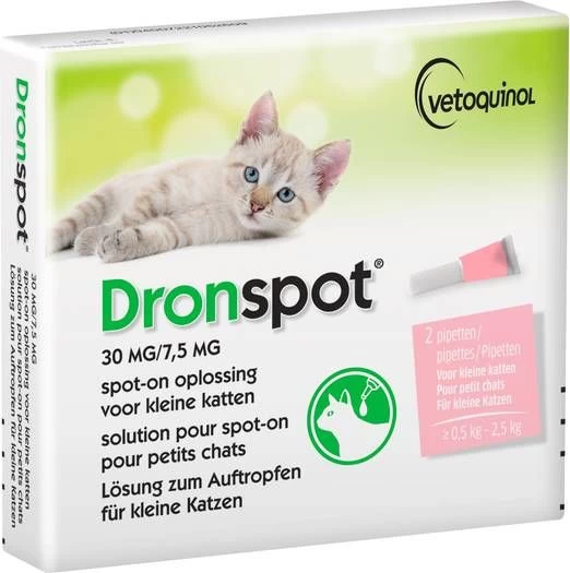 Dronspot 30 mg/7,5 mg Spot-on oplossing voor katten (0,5 2,5 kg) is een ontwormingsoplossing voor kleine katten.