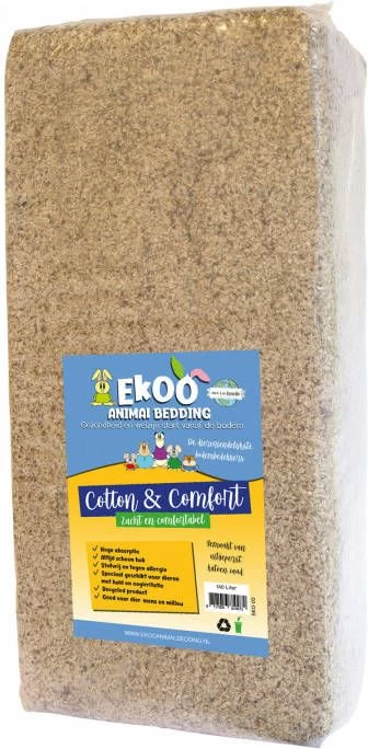 Ekoo Cotton en Comfort 140 ltrEkoo Cotton en Comfort is een zacht en comfortabel product. Gemaakt van 100% uitgeperst katoenzaad met natuurlijke katoenvezel. Land van oorsprong: Beninβ West- Afrika. Voor welke dieren: konijn, cavia, hamster, muis en een deel van de ratten. * Hoge absorptie * Altijd een schoon hok * Stofarm en tegen allergie * Speciaal geschikt voor dieren met voetzoolproblemen, oog- en huidirritatie * Recycling product * Goed voor dier, mens en onze planeet.