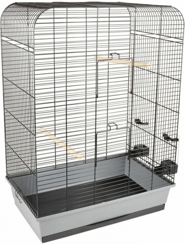 Het stalen kooitje heeft 2 zitstokken en 2 kunststof bakjes. Dankzij deze bakjes kan je je vogel altijd voldoende water en voer geven. De deurtje.