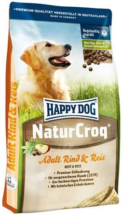 Happy Dog NaturCroq Rind & Reis (Rund en Rijst) zijn droge brokken voor de volwassen hond. Deze voeding is zeer goed verteerbaar en geschikt voor alle hondenrassen met een normale energie behoefte.