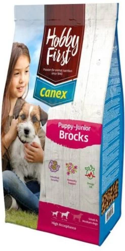 HobbyFirst Canex Puppy-Junior Brocks hondenvoer is een geëxtrudeerde hondenvoeding voor opgroeiende pups vanaf 4 weken en junioren van kleine en middelgrote rassen.