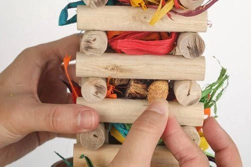 Vogels houden van slopen, het zit in hun aard. Naast dat het knagen op dingen tegen verveling werkt, slijpt het ook gelijk hun snavel. Op dit speeltje kunnen ze dan ook gemakkelijk hun knaagbehoeftes kwijt.