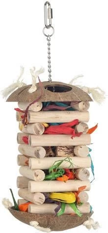Papegaaienspeeltje Stacker- Afmeting: 33x11cm. Dit leuke speelgoed is geschikt voor de kleinere kromsnavels en biedt volop uitdaging. Het speeltje bestaat uit twee halve kokosnoten met daartussen dennenhout en een kleurige vulling.