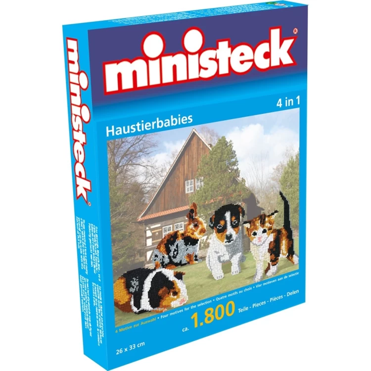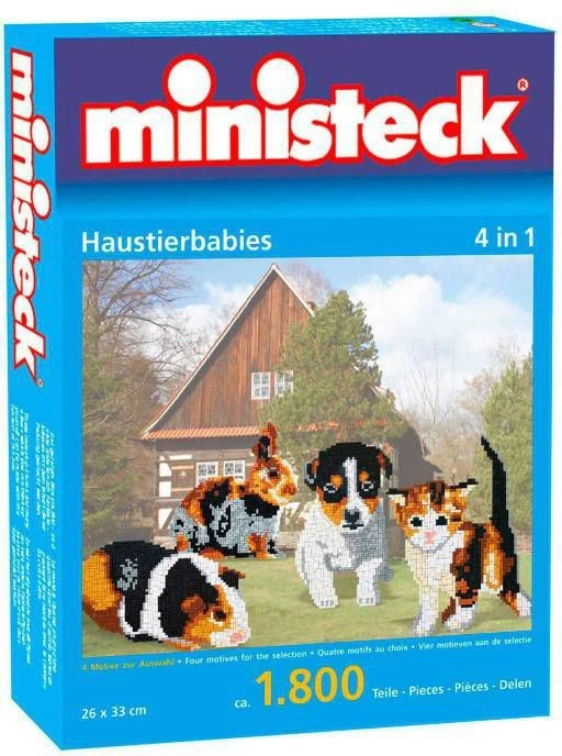 Ministeck set om de afbeelding van jonge huisdieren te maken.Natuurlijk kun je ook je eigen fantasie gebruiken om de mooiste kunstwerken te ontwerpen. Ministeck bevordert de fijne motoriek en concentratie.