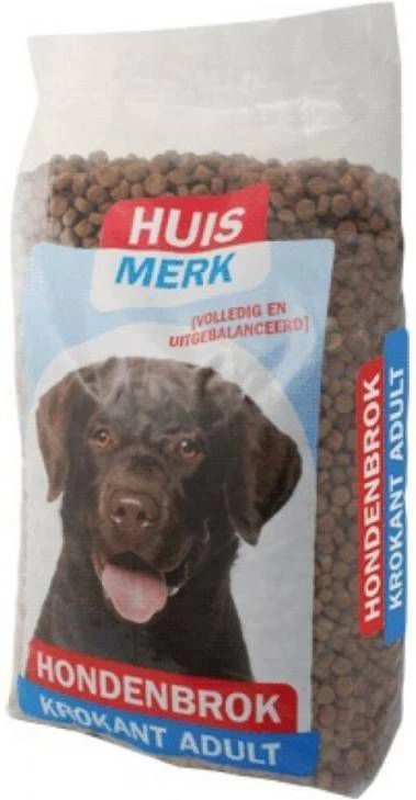 Huismerk Krokante Brok hondenvoer is een volledige voeding voor volwassen honden van alle rassen.