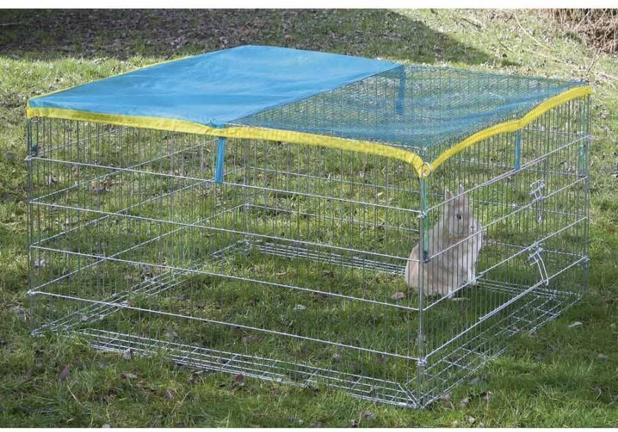 Konijnenren Dante- Afmeting: 115x115x65cm Konijnenren Dante is een mooie en compacte konijnenren geschikt voor je konijnen om eens lekker rond te huppelen op het gras. Het anti-uitgraafsysteem zorgt ervoor dat ze zich niet makkelijk kunnen uitgraven. Konijnenren Dante is een gegalvaniseerde ren en wordt geleverd inclusief afdeknet. Tevens dient de helft van het afdeknet als zonnescherm.