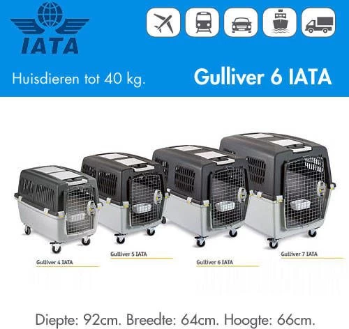 Transportbox Gulliver Mega grote honden tot 40 kg.- Afmetingen: 92 x 64 x 66 cm.Duurzame kwaliteit transportbox met metalen deur voor het comfortabel en veilig vervoeren van middelgrote honden tot 40kg. IATA gekeurd en geschikt voor reizen per vliegtuig. De luchtroosters over de hele diepte van de transportbox zorgen voor een optimale ventilatie en biedt extra comfort voor je hond.De vervoersbox is ideaal voor het reizen per auto, trein, vliegtuig, boot of camper. De ruime metalen toegangsdeur heeft een dubbelwerkend veiligheidsslot. Bovenop op de box zitten 2-handige opbergvakken voor het bewaren van bijvoorbeeld de set wielen of een extra voerbak. Het gebruik van de vervoersbox in combinatie met de handige set wielen (optioneel leverbaar) geeft je nog meer mobiliteit en gebruikersgemak. Geleverd inclusief een water/voerbak.Onder andere geschikt voor:Buldog, Chow Chow, Dalmatiër, Siberian Husky, Labrador Retriever.