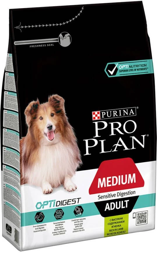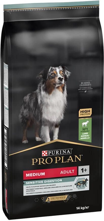 Pro Plan Adult Medium Sensitive Digestion LamComplete voeding voor volwassen honden van medium rassen met een gevoelige spijsverteringPurina Pro Plan Dog Medium Adult Sensitive Digestion met OPTIdigest® is makkelijk verteerbare voeding die het spijsverteringsproces van honden vergemakkelijken en een uitstekende kwaliteit van de ontlasting bevorderen.