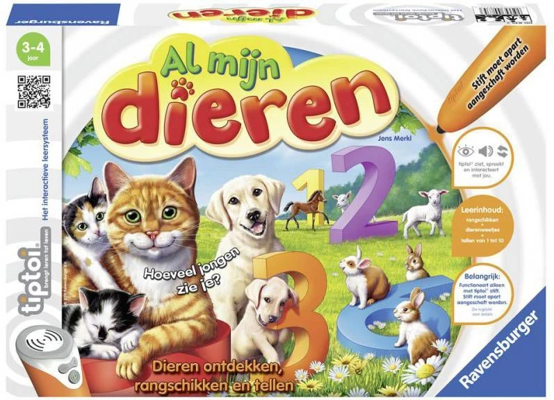 Met het Tiptoi spel Al mijn dieren van Ravensburger leren kinderen tellen van één tot tien en oefenen ze logica en concentratie. Het spel bevat ook dierengeluiden met daarbij informatie over tien binnenlandse soorten. Mèèèèèèhh zegt het schaap. Weet jij hoe je de jongen van het schaap noemt? Wat eten konijnen graag? En waar woont de vos? Zoek tussen de puzzelstukken en kijk wat goed past. Liedjes en dierengeluiden laten de dierenwereld tot leven komen. Bij het puzzelen en rangschikken van de dieren leer je te concentreren. Wie weet welk dier de appel lust? En hoeveel jongen heeft de egel? Samen met tiptoi leer je de getallen van één tot tien. Tiptoi is het interactieve leersysteem voor boeken, spellen en puzzels van Ravensburger. Het is een innovatief leersysteem waarmee kinderen spelenderwijs de wereld ontdekken. Als je kind met de stift op een afbeelding of tekst tipt, klinken er bijbehorende geluiden, gesproken tekst of muziek. De elektronische intelligentie biedt kinderen de mogelijkheid om boeken en spellen helemaal zelfstandig steeds weer opnieuw te beleven.