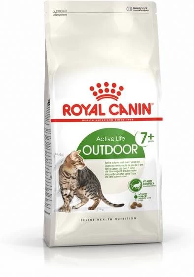 Royal Canin Outdoor +7Speciale voeding die volledig voorziet in de veerhoogde energiebehoefte van je oudere kat die gewend is zo nu en dan even buiten te spelen.