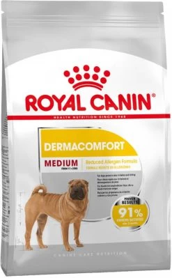 Royal Canin Medium Dermacomfort hondenvoer is voor middelgrote honden met een volwassen gewicht van 11 tot 25 kilo en een gevoelige huid.