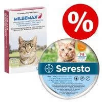 Seresto vlooienhalsband en Milbemax tabletten zijn beide een farmaceutisch product. De grijze, geurloze vlooienhalsband gaat vlooien en teken tegen. De deelbare filmtabletten van Milbemax met de werkstof praziquantel voor orale toediening ter behandeling van infecties met lintwormen en spoelwormen bij katten. Dit beschermingspakket voor een half jaar is gebaseerd op het lichaamsgewicht van jouw kat en bevat de volgende producten: Voor katten tot 4 kg 1 x Seresto vlooienhalsband voor katten 4 tabletten Milbemax Kitten / Small Cat Katten van 0kg-2kg – 1 tablet per behandeling Katten van 2kg-4kg – 2 tabletten per behandeling Voor katten vanaf 4 kg 1 x Seresto vlooienhalsband voor katten 2 tabletten Milbemax Large Cat.