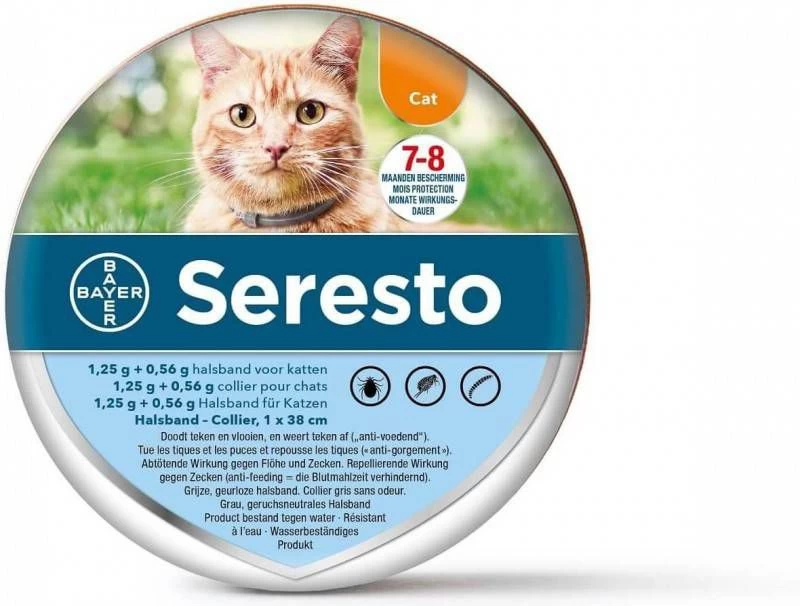 Seresto Halsband voor de kat is een farmaceutisch product die werkt tegen teken en vlooien. Het heeft een dodelijke werking op vlooien en teken gedurende 7 tot 8 maanden. De halsband werkt direct nadat je hem hebt aangebracht. Het werkt niet alleen op de kat zelf, ook de omgeving heeft er voordeel van. Gedurende 8 maanden is de omgeving namelijk ook beschermd tegen het ontwikkelen van vlooienlarven. Ook kan de Seresto Halsband voor de kat gebruikt worden als behandeling tegen vlooienallergiedermatitis. Voor katten vanaf 10 weken oud.