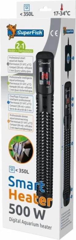 De Smart Heater van Superfish verwarmt je aquarium met een constante temperatuur tussen de 17 en 34 °C én laat de temperatuur zien. De aquariumverwarming is makkelijk in gebruik en heeft een nauwkeurige temperatuurregeling. Verder heeft de heater 2 mm kwarts veiligheidsglas met een kunststofprotector. Ook heeft de heater een lange kabel en aan de voorkant zit een display waar je de temperatuur kunt aflezen.