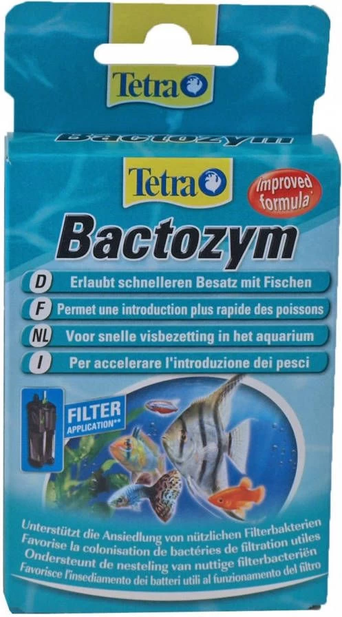 De Bactozym van Tetra draagt zorgt voor een biologische activiteit in het aquarium. Natuurlijk organische colloïden vormen een onzichtbaar laagje op het filtermateriaal en alle andere oppervlakken. Hierdoor stimuleren ze de nesteling van nuttige filterbacteriën. Daardoor kunnen de eerste vissen al na 24 uur in het nieuwe aquarium gezet worden. Het water verversen en het filter vervangen is mogelijk zonder ernstig verlies van de biologische activiteit. De geselecteerde enzymen zorgen voor minder waterverontreiniging en helder water. De door geneesmiddelen verzwakte of beschadigde micro-organismen worden weer gerevitaliseerd. Deze verbeterde formule met zeer actieve enzymen en sporen werkt direct en langdurig. Geschikt voor alle zoet- en zeewateraquaria.
