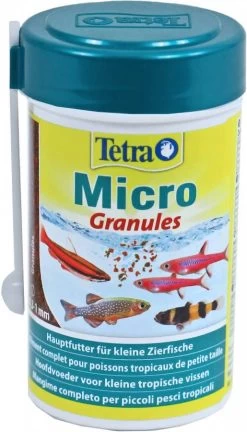 Tetra Micro granulaat (korrels) is geschikt als compleet voedsel voor alle siervissen met kleine bek, die zich voeden in het midden- en het bodemgebied van het water. Deze korrels met een extra kleine diameter van 0,3 tot 1 mm bevatten voedingsstoffen van topkwaliteit en hebben een uitgebalanceerde formule die bestaat uit plantaardige en dierlijke ingrediënten. De kleine Tetra Micro-korrels zijn daarom ideaal voor kleine vissen, omdat ze snel zacht worden in het water, waardoor ze gemakkelijk te eten zijn. Ze bevatten ook voedingsstoffen van topkwaliteit en hebben een uitgebalanceerde formule met ingrediënten op basis van planten en dieren. Als zodanig bieden ze alles wat planten- en vleesetende vis nodig heeft voor een uitgebalanceerd dieet dat is afgestemd op hun behoeften. De rode korrels bevatten ook carotenoïden om de levendigheid van de vis in de kleur te verbeteren, terwijl de groene korrels gemaakt zijn van plantaardige ingrediënten om de gezondheid en vitaliteit te ondersteunen. Bovendien is dit complete voedsel zeer goed verteerbaar, waardoor het water helder blijft. Al met al is Tetra Micro granulaat een ideaal compleet voedsel voor alle kleine siervissen en jonge, groeiende cichliden en zeevis.