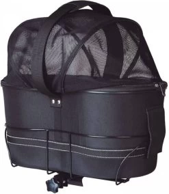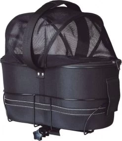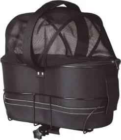 Trixie Fietsmand Achterop met Kussen en Kap Zwart De Trixie Fietsmand is een handige fietsmand voor de hond voor achterop de fiets. Deze handige een stevige fietsmand is gemaakt van vormvast EVA. De fietsmand heeft een robuust metalen frame voor een veilig vervoer op de bagagedrager. De mand zit vast aan het frame met klittenband en kan worden losgemaakt van het frame, en op die manier ook worden worden gebruikt als transportas. Multifunctioneel dus! Over de mand zit een gaas-afdekking waardoor de hond niet uit de mand kan springen, waardoor er ook goede luchtcirculatie is in de fietstas. Voor nog meer comfort is er ook een gevoerde bodem van pluche aangebracht, die uitneembaar is, zodat je hond onderweg een fijn, zacht plekje heeft om te zitten. Daarnaast zit er een korthouder in de mand, een korte riem, die ervoor zorgt dat je hond niet zomaar uit de mand kan springen. Aan de buitenzijde van de mand zitten reflecterende strepen zodat de mand goed zichtbaar is in het donker en jullie veilig op weg kunnen! * Fijne mand voor achterop de fiets * Van vormvast EVA * Met stevig metalen frame voor op de bagagedrager (breedte 12-17 centimeter), bevestiging door middel van klittenband * Met geïntegreerde korthoudervoor de veiligheid * De gevoerde, pluche bodem is uitneembaar en zorgt voor meer comfort * Met gaasafdekking voor optimale bescherming en goede luchtcirculatie * Maximaal draaggewicht 6 kg.