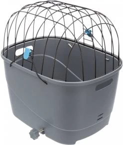 De mand zelf van deze fietsmand is gemaakt van kunststof. De draadkoepel bovenop is gepoedercoat. Je kan de mand met behulp van het mechanisme vastmaken aan je bagagedrager. Dankzij de koepel zit je hond veilig in de mand en kan deze er niet uitspringen, toch kan hij tegelijkertijd wel genieten van zijn omgeving met de wind in de haren! Door de twee uitsparingen aan de zijkant is de mand ook makkelijk op te pakken en te dragen.