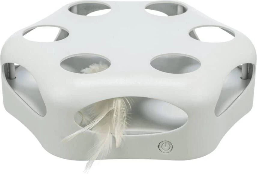Het kattenspeeltje Turning Feather van Trixie stimuleert het natuurlijke jachtinstinct van jouw kat, zorgt voor speelplezier en bevordert gelijktijdig haar behendigheid. Binnenin het zeshoekige huisje zitten animerende veren. Met een druk op de knop in beweging gezet dwarrelen ze wild in het rond, stoppen plotseling en wisselen van richting. Door de verschillend grote openingen aan de boven- en zijkant kan jouw kat de rondtollende buit achternajagen, met de poten aanstoten of proberen te pakken. Omdat de bewegingsafloop van de veren onvoorspelbaar is en de veren altijd op een andere plek uit de openingen tevoorschijn komen, zorgen de Turning Feathers voor gevarieerd speelplezier. Via de ronde en ovale gaten kun je het huisje met kleine snacks vullen en zo het bewegingseffect versterken. De antislip-voetjes zorgen ervoor, dat het speeltje zelfs op gladde vloeren stabiel en veilig staat. Slim ontworpen speeltje voor alle katten voor veel plezier en meer activiteit. Trixie kattenspeeltje Turning Feather in één oogopslag: Actie-speeltje voor katten Animerend: speciaal ontwikkeld om het natuurlijke jacht- en speelinstinct te stimuleren Bevordert behendigheid en activiteit: ronddwarrelende veren animeren om te vangen en aanstoten met de poten Hoge bezigheidsfactor: veren tollen onvoorspelbaar in het rond, stoppen en wisselen van richting, voor gevarieerd en lang speelplezier Slim design: 6-hoekig huisje met verschillende grote openingen, waardoor jouw kat met de poten naar de veren kan grijpen Anti-slip-voetjes voor stevig houvast Met snacks te vullen: stimuleren het spelen extra Makkelijke bediening: met een druk op de knop in beweging te zetten, schakelt automatisch na 15 min uit Batterij-werking: 3 AA-mignon-batterijen, niet bij de levering inbegrepen Kleur: lichtgrijs Materiaal: kunststof, veren Afmeting: Totaal: à 22 x H 6 cm Openingen bovenkant: ca. à 3,5 cm Openingen zijkant: ca. H 3 x B 8 cm Opmerking: Zoals bij ieder ander speeltje dien je jouw dier bij het spelen hiermee in de gaten te houden. Controleer het speeltje regelmatig op beschadigingen en vervang het als het defect is of onderdelen ontbreken, omdat anders verwonding van jouw dier niet kan worden uitgesloten.