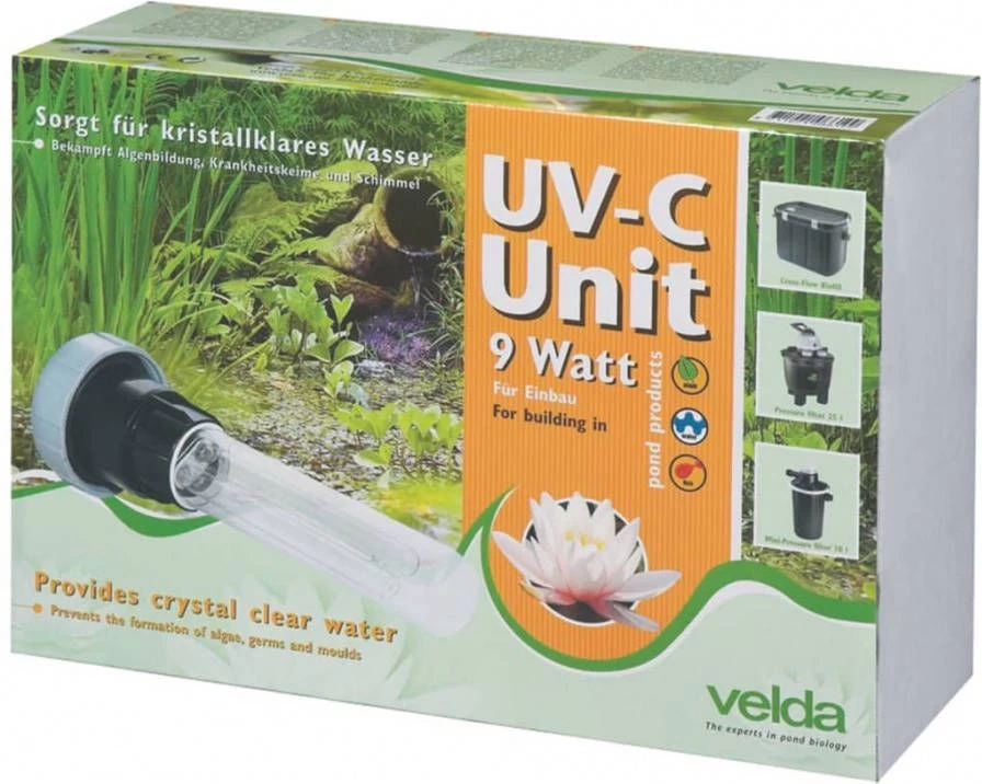 Alle Velda filters zijn voorzien van speciale inbouw UV-C Units. Deze losse units zijn te gebruiken voor de Clear Control drukfilters, Cross-Flow Biofill en Giant Biofill XL. De werking berust op ultraviolette straling, die de cellen van groene zweefalgen en ziektekiemen aantast. In korte tijd krijg je kristalhelder vijverwater en een gezonde omgeving voor vissen en waterplanten. Voorzien van speciale long life UV-C lampen.