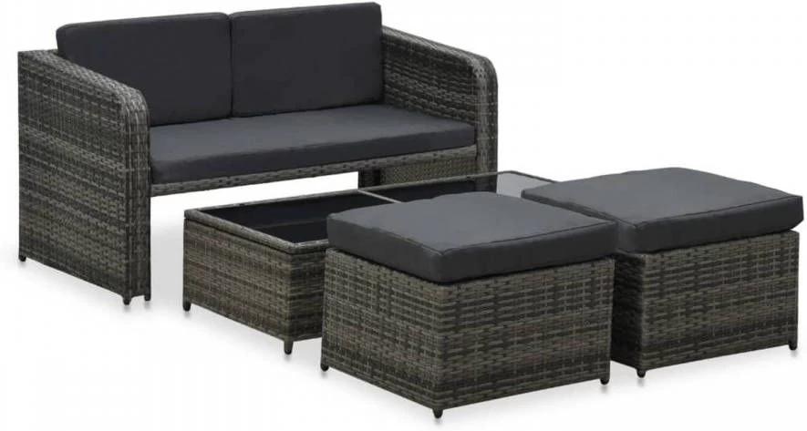 4-delige Loungeset met kussens poly rattan antraciet. De set is gemaakt van stevig gepoedercoat staal en hoogwaardig PE ratten, dit maakt deze set enorm duurzaam. De dikke verwijderbare kussen zijn erg comfortabel. Het speciaal ontworpen uitvouwsysteem in de salontafel heeft een glazen tafelblad, dit maakt hem eenvoudig schoon te maken met een vochtige doek.
