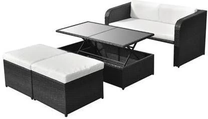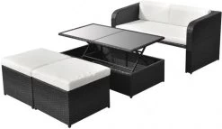 Deze stijlvolle en functionele poly rattan loungeset zal de blikvanger van uw tuin of terras worden. De set is gemaakt van stevig gepoedercoat staal en hoogwaardig PE ratten, dit maakt deze set enorm duurzaam. De dikke verwijderbare kussen zijn erg comfortabel. Het speciaal ontworpen uitvouwsysteem in de salontafel heeft een glazen tafelblad, dit maakt hem eenvoudig schoon te maken met een vochtige doek. Meegeleverd wordt: 1 x bank, 1 x salontafel, 2 x hocker, 3 x zitkussen en 2 x rugkussen. Opmerking: Wij raden aan de loungeset af te dekken wanneer het regent, sneeuwt of vriest.